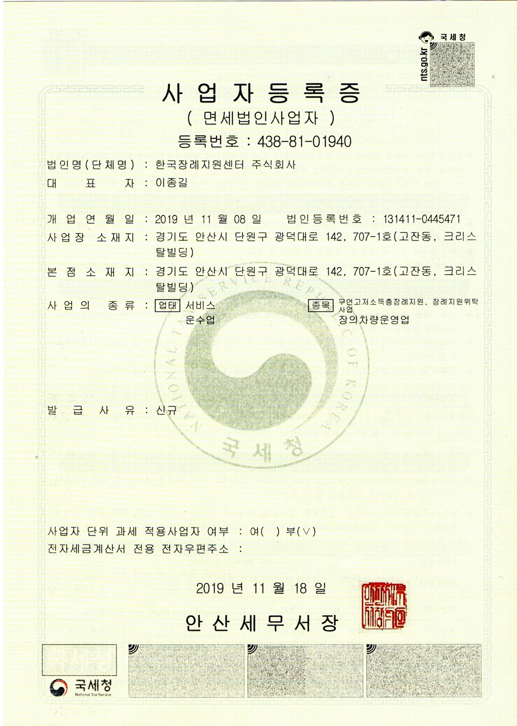 한국장례지원센터 주식회사 면세법인 사업자등록증 페이지 정보 작성자 운영자 댓글 0건 조회 1,943회 작성일 20-02-11 15:31 본문 한국장례지원센터 주식회사 면세법인 사업자등록증 SNS공유 목록 다음글사단법인 돌보미연대, 경기도 민간단체등록증 20.02.11 댓글목록 댓글목록 등록된 댓글이 없습니다.